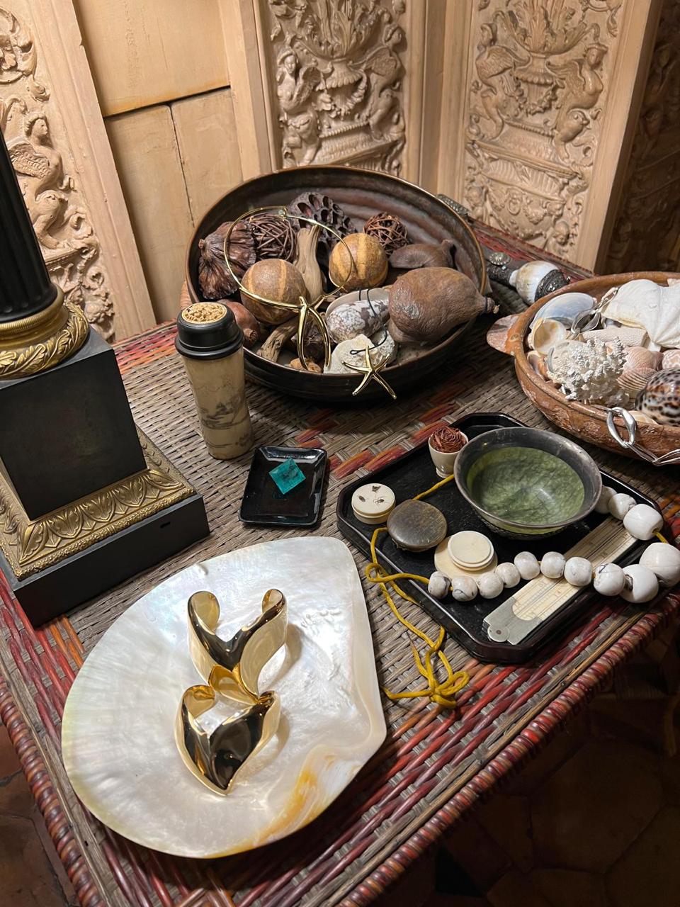 bols en pierre, coquillages, sculptures fines, matières brutes et naturelles.