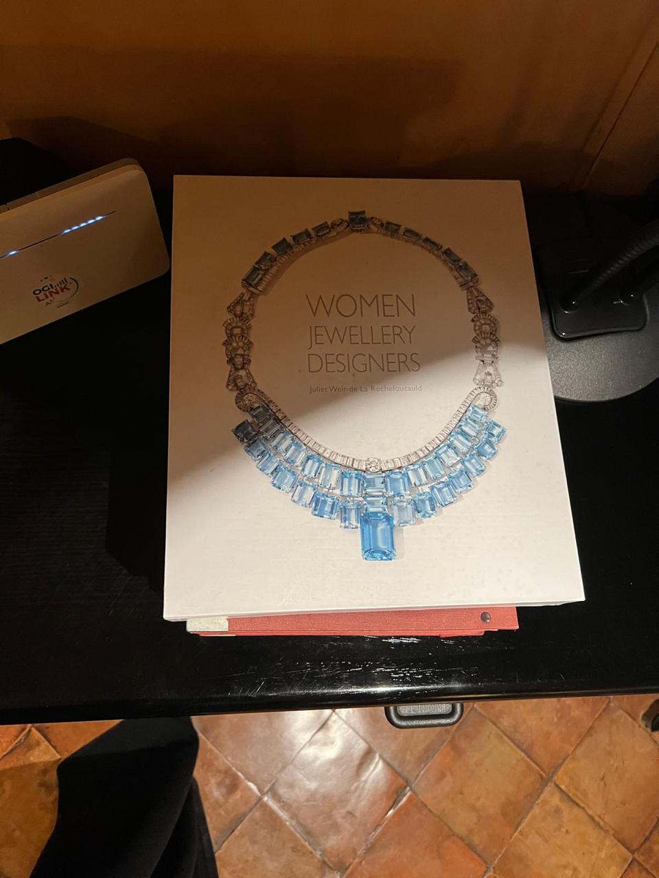 Un peu plus loin, un catalogue prestigieux dévoile un collier d’exception : un bijou signé Tiffany & Co., indiqué dans l’un des clichés.