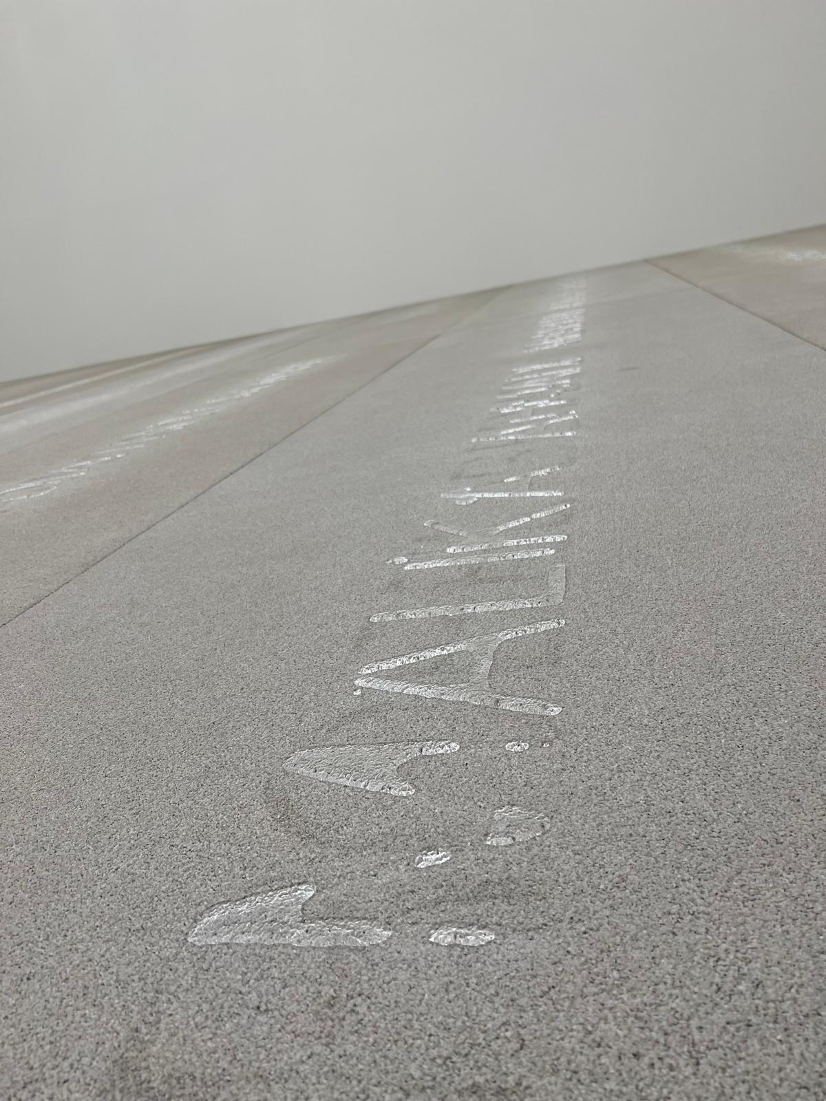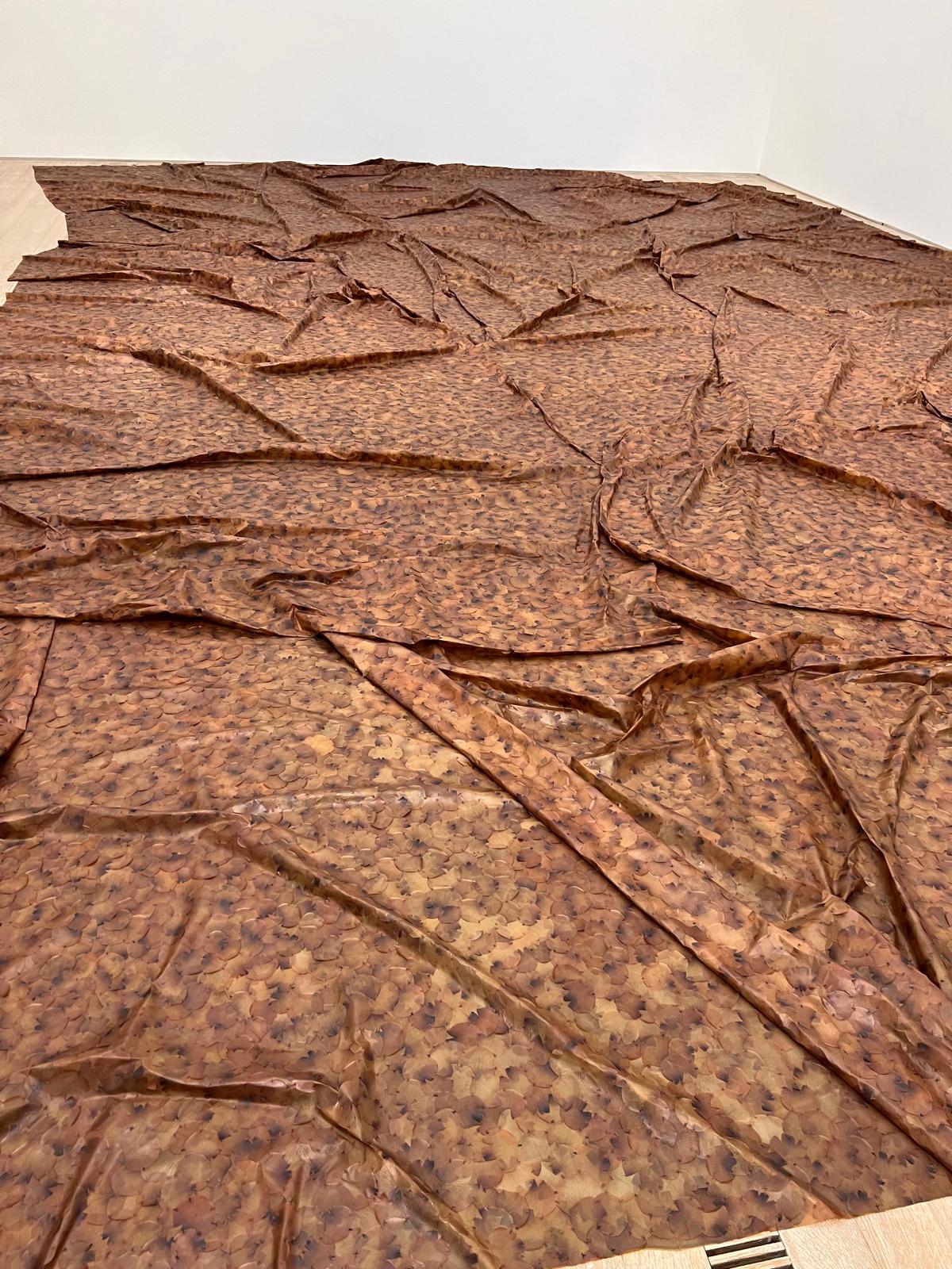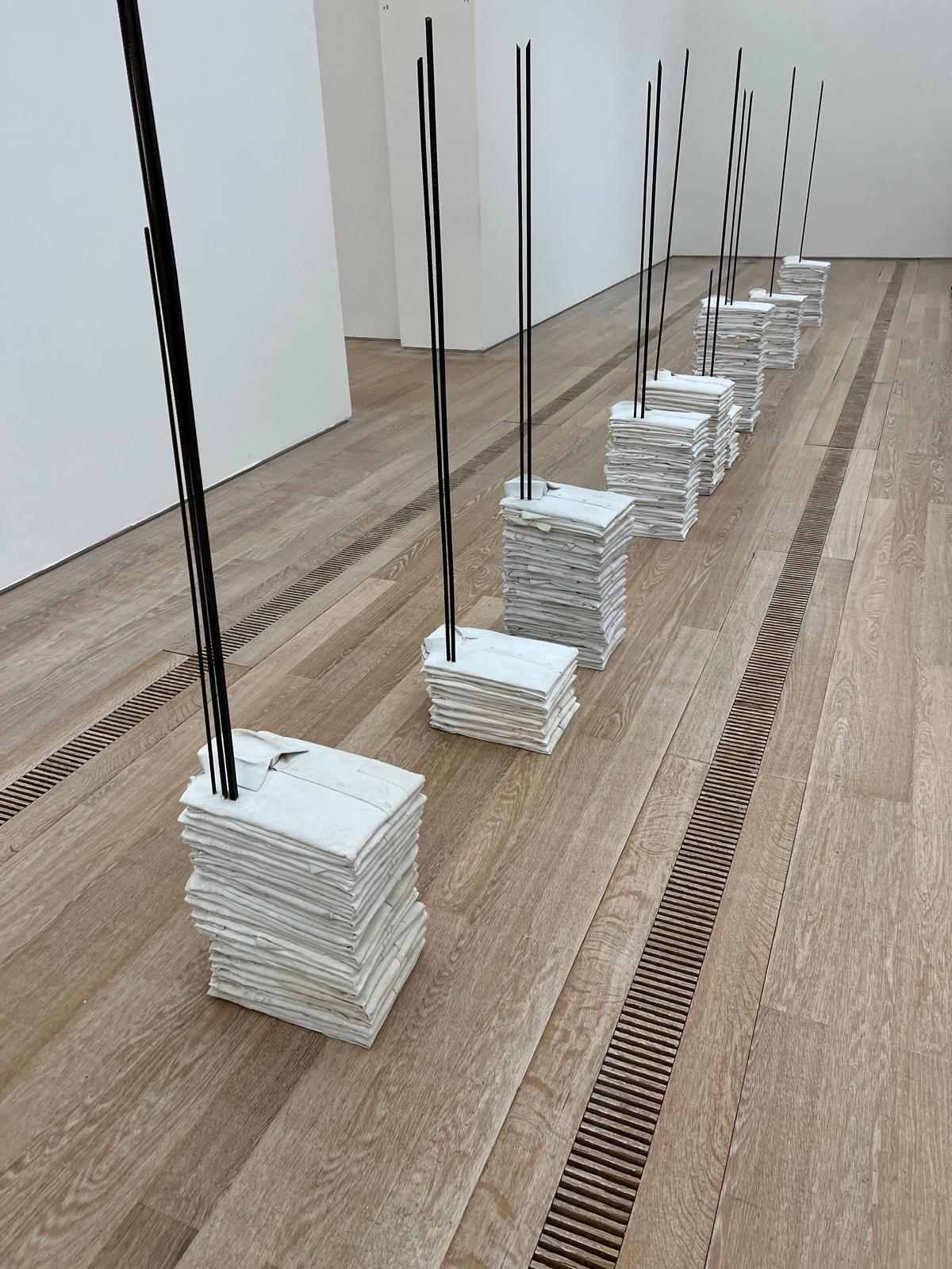 On passe d’un travail presque géologique — une surface texturée comme un paysage craquelé — à des installations sculpturales où les volumes se déclinent en série, suspendus entre sol et ciel.