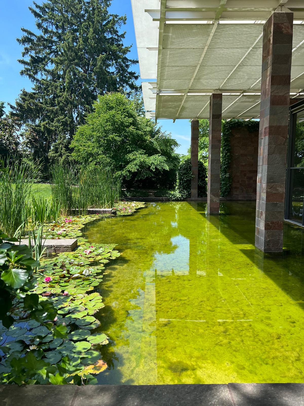 Les bassins se teintent de vert, les sculptures se reflètent dans l’eau, et l’ensemble compose un paysage presque onirique.